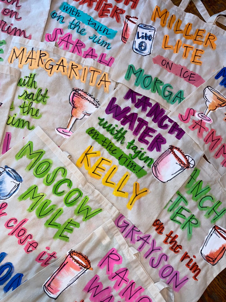 Our Canvas Totes are the best accessory for any Bachelorette trip! The design includes each individual's name & drink order on one side and the theme of the Bach on the other. Please fill out the form to order!